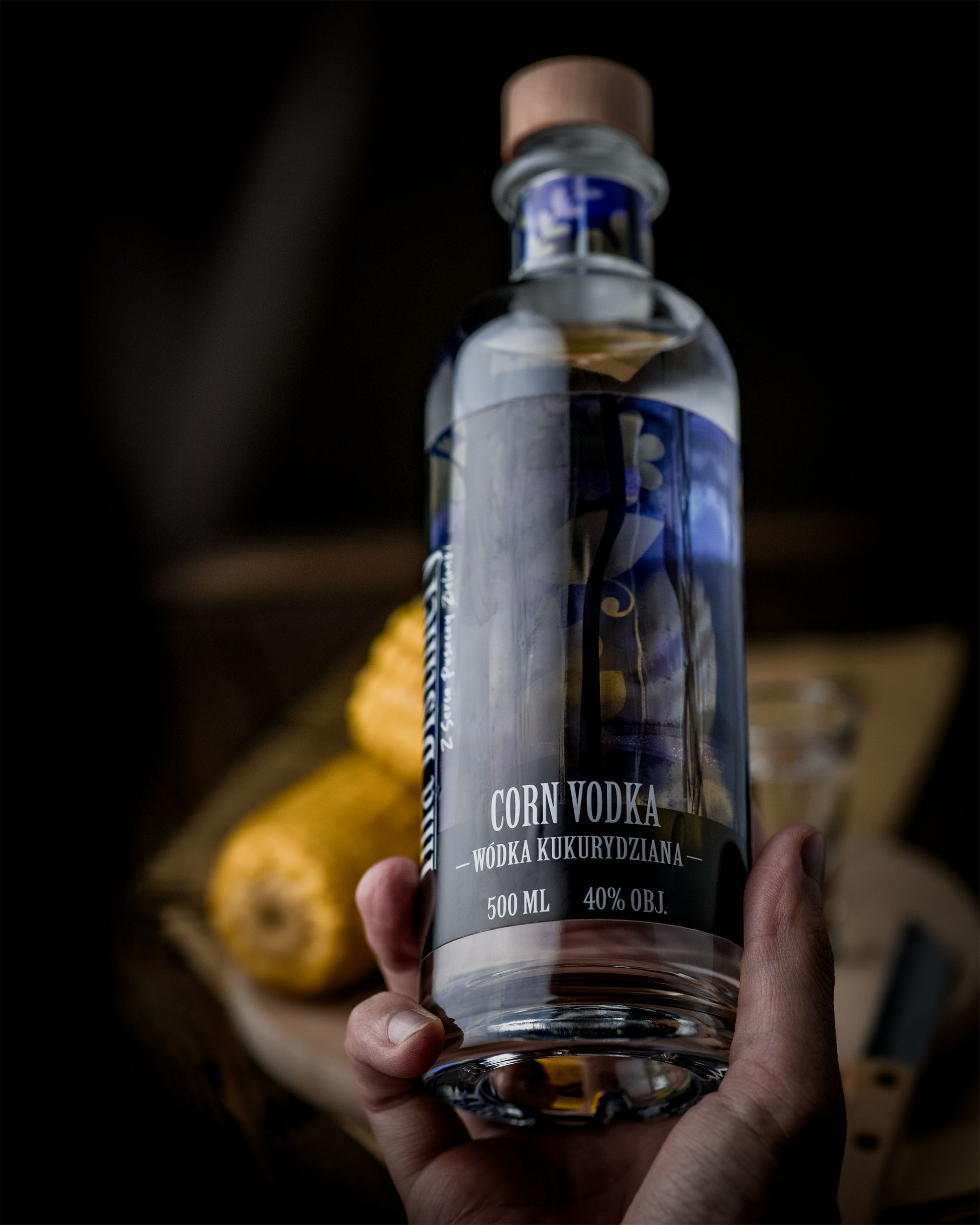 Corn vodka is made of freshly harvested raw material, immediately after the harvest around October. Only ripe corn contains required amount of sugar. Corn Vodka achieves the highest level of taste perfection thanks to multiple filtration and distillation of corn grains, collected from fields nerby the Zielonka Forest and cristal clear water from our own intake.